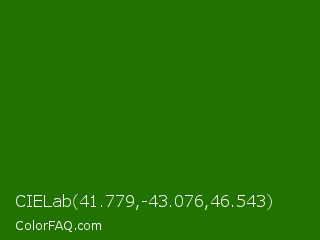 CIELab 41.779,-43.076,46.543 Color is a very dark green color and the nearest color is Napier Green #2a8000. Hex code #217200 and RGB value is rgb(33,114,0). In RGB color space, this color is composed of 13% red, 45% green, 0% blue, In CMYK color space, this color is composed of 71% cyan, 0% magenta, 100% yellow , 55% black , In HSL color space, this color has a hue angle of 103° , 100% saturation and 22% lightness.