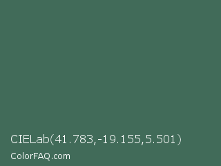 CIELab 41.783,-19.155,5.501 Color is a normal green color and the nearest color is Mineral Green #3f5d53. Hex code #416b59 and RGB value is rgb(65,107,89). In RGB color space, this color is composed of 25% red, 42% green, 35% blue, In CMYK color space, this color is composed of 39% cyan, 0% magenta, 17% yellow , 58% black , In HSL color space, this color has a hue angle of 154° , 24% saturation and 34% lightness.