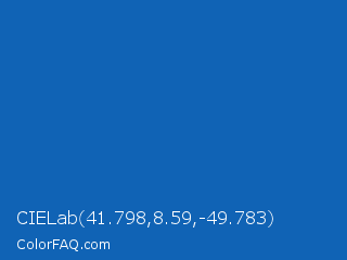 CIELab 41.798,8.59,-49.783 Color is a normal blue color and the nearest color is Green Blue #1164b4. Hex code #1063b5 and RGB value is rgb(16,99,181). In RGB color space, this color is composed of 6% red, 39% green, 71% blue, In CMYK color space, this color is composed of 91% cyan, 45% magenta, 0% yellow , 29% black , In HSL color space, this color has a hue angle of 210° , 84% saturation and 39% lightness.