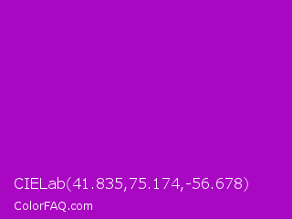 CIELab 41.835,75.174,-56.678 Color is a normal magenta color and the nearest color is Heliotrope Magenta #aa00bb. Hex code #a808c2 and RGB value is rgb(168,8,194). In RGB color space, this color is composed of 66% red, 3% green, 76% blue, In CMYK color space, this color is composed of 13% cyan, 96% magenta, 0% yellow , 24% black , In HSL color space, this color has a hue angle of 292° , 92% saturation and 40% lightness.