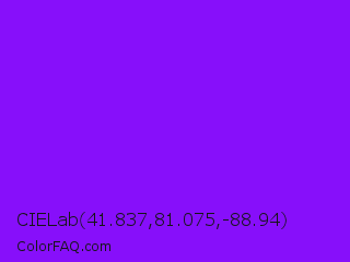 CIELab 41.837,81.075,-88.94 Color is a normal purple color and the nearest color is Electric Violet #8b00ff. Hex code #870ffa and RGB value is rgb(135,15,250). In RGB color space, this color is composed of 53% red, 6% green, 98% blue, In CMYK color space, this color is composed of 46% cyan, 94% magenta, 0% yellow , 2% black , In HSL color space, this color has a hue angle of 271° , 96% saturation and 52% lightness.
