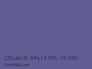 CIELab 41.844,14.596,-29.936 Color is a normal indigo color and the nearest color is Dark Blue Gray #666699. Hex code #5f5d94 and RGB value is rgb(95,93,148). In RGB color space, this color is composed of 37% red, 36% green, 58% blue, In CMYK color space, this color is composed of 36% cyan, 37% magenta, 0% yellow , 42% black , In HSL color space, this color has a hue angle of 242° , 23% saturation and 47% lightness.