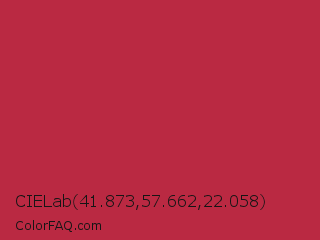 CIELab 41.873,57.662,22.058 Color is a normal red color and the nearest color is Brick Red #c62d42. Hex code #ba2942 and RGB value is rgb(186,41,66). In RGB color space, this color is composed of 73% red, 16% green, 26% blue, In CMYK color space, this color is composed of 0% cyan, 78% magenta, 65% yellow , 27% black , In HSL color space, this color has a hue angle of 350° , 64% saturation and 45% lightness.