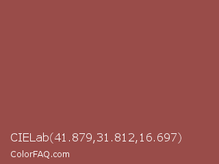 CIELab 41.879,31.812,16.697 Color is a normal red color and the nearest color is Copper Rust #944747. Hex code #994c49 and RGB value is rgb(153,76,73). In RGB color space, this color is composed of 60% red, 30% green, 29% blue, In CMYK color space, this color is composed of 0% cyan, 50% magenta, 52% yellow , 40% black , In HSL color space, this color has a hue angle of 2° , 35% saturation and 44% lightness.