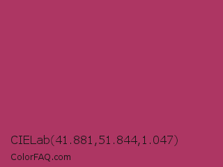 CIELab 41.881,51.844,1.047 Color is a normal rose color and the nearest color is Rich Maroon #b03060. Hex code #ad3663 and RGB value is rgb(173,54,99). In RGB color space, this color is composed of 68% red, 21% green, 39% blue, In CMYK color space, this color is composed of 0% cyan, 69% magenta, 43% yellow , 32% black , In HSL color space, this color has a hue angle of 337° , 52% saturation and 45% lightness.