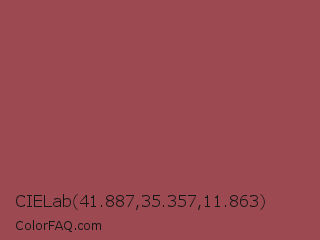 CIELab 41.887,35.357,11.863 Color is a normal red color and the nearest color is Copper Rust #944747. Hex code #9c4951 and RGB value is rgb(156,73,81). In RGB color space, this color is composed of 61% red, 29% green, 32% blue, In CMYK color space, this color is composed of 0% cyan, 53% magenta, 48% yellow , 39% black , In HSL color space, this color has a hue angle of 354° , 36% saturation and 45% lightness.