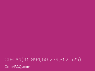 CIELab 41.894,60.239,-12.525 Color is a normal magenta color and the nearest color is Royal Heath #ab3472. Hex code #b22979 and RGB value is rgb(178,41,121). In RGB color space, this color is composed of 70% red, 16% green, 47% blue, In CMYK color space, this color is composed of 0% cyan, 77% magenta, 32% yellow , 30% black , In HSL color space, this color has a hue angle of 325° , 63% saturation and 43% lightness.