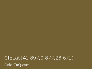 CIELab 41.897,0.877,28.671 Color is a normal orange color and the nearest color is Yellow Metal #716338. Hex code #736133 and RGB value is rgb(115,97,51). In RGB color space, this color is composed of 45% red, 38% green, 20% blue, In CMYK color space, this color is composed of 0% cyan, 16% magenta, 56% yellow , 55% black , In HSL color space, this color has a hue angle of 43° , 39% saturation and 33% lightness.