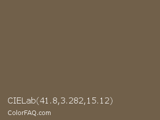 CIELab 41.8,3.282,15.12 Color is a normal orange color and the nearest color is Tobacco Brown #715d47. Hex code #71604a and RGB value is rgb(113,96,74). In RGB color space, this color is composed of 44% red, 38% green, 29% blue, In CMYK color space, this color is composed of 0% cyan, 15% magenta, 35% yellow , 56% black , In HSL color space, this color has a hue angle of 34° , 21% saturation and 37% lightness.