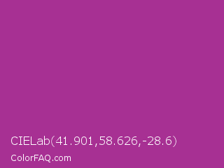 CIELab 41.901,58.626,-28.6 Color is a normal magenta color and the nearest color is Fandango #b53389. Hex code #a73093 and RGB value is rgb(167,48,147). In RGB color space, this color is composed of 65% red, 19% green, 58% blue, In CMYK color space, this color is composed of 0% cyan, 71% magenta, 12% yellow , 35% black , In HSL color space, this color has a hue angle of 310° , 55% saturation and 42% lightness.