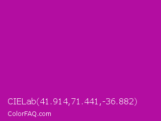 CIELab 41.914,71.441,-36.882 Color is a normal magenta color and the nearest color is Violet Eggplant #991199. Hex code #b30da1 and RGB value is rgb(179,13,161). In RGB color space, this color is composed of 70% red, 5% green, 63% blue, In CMYK color space, this color is composed of 0% cyan, 93% magenta, 10% yellow , 30% black , In HSL color space, this color has a hue angle of 307° , 86% saturation and 38% lightness.