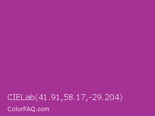 CIELab 41.91,58.17,-29.204 Color is a normal magenta color and the nearest color is Fandango #b53389. Hex code #a63194 and RGB value is rgb(166,49,148). In RGB color space, this color is composed of 65% red, 19% green, 58% blue, In CMYK color space, this color is composed of 0% cyan, 70% magenta, 11% yellow , 35% black , In HSL color space, this color has a hue angle of 309° , 54% saturation and 42% lightness.