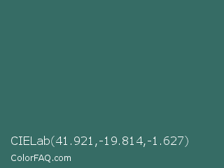 CIELab 41.921,-19.814,-1.627 Color is a normal cyan color and the nearest color is William #3a686c. Hex code #366c65 and RGB value is rgb(54,108,101). In RGB color space, this color is composed of 21% red, 42% green, 40% blue, In CMYK color space, this color is composed of 50% cyan, 0% magenta, 6% yellow , 58% black , In HSL color space, this color has a hue angle of 172° , 33% saturation and 32% lightness.