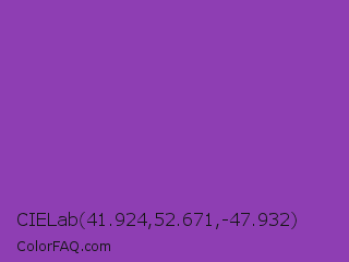 CIELab 41.924,52.671,-47.932 Color is a normal purple color and the nearest color is Purpureus #9a4eae. Hex code #8e3eb3 and RGB value is rgb(142,62,179). In RGB color space, this color is composed of 56% red, 24% green, 70% blue, In CMYK color space, this color is composed of 21% cyan, 65% magenta, 0% yellow , 30% black , In HSL color space, this color has a hue angle of 281° , 49% saturation and 47% lightness.