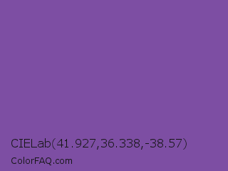 CIELab 41.927,36.338,-38.57 Color is a normal purple color and the nearest color is Royal Purple #7851a9. Hex code #7d4ea3 and RGB value is rgb(125,78,163). In RGB color space, this color is composed of 49% red, 31% green, 64% blue, In CMYK color space, this color is composed of 23% cyan, 52% magenta, 0% yellow , 36% black , In HSL color space, this color has a hue angle of 273° , 35% saturation and 47% lightness.