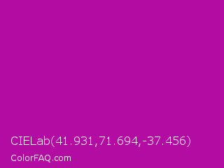CIELab 41.931,71.694,-37.456 Color is a normal magenta color and the nearest color is Violet Eggplant #991199. Hex code #b30ca2 and RGB value is rgb(179,12,162). In RGB color space, this color is composed of 70% red, 5% green, 64% blue, In CMYK color space, this color is composed of 0% cyan, 93% magenta, 9% yellow , 30% black , In HSL color space, this color has a hue angle of 306° , 87% saturation and 37% lightness.
