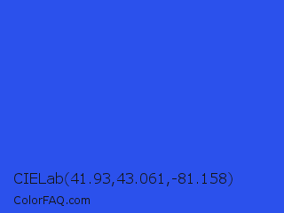 CIELab 41.93,43.061,-81.158 Color is a normal blue color and the nearest color is Palatinate Blue #273be2. Hex code #2b51ec and RGB value is rgb(43,81,236). In RGB color space, this color is composed of 17% red, 32% green, 93% blue, In CMYK color space, this color is composed of 82% cyan, 66% magenta, 0% yellow , 7% black , In HSL color space, this color has a hue angle of 228° , 84% saturation and 55% lightness.