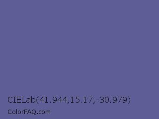 CIELab 41.944,15.17,-30.979 Color is a normal indigo color and the nearest color is Dark Blue Gray #666699. Hex code #5f5d96 and RGB value is rgb(95,93,150). In RGB color space, this color is composed of 37% red, 36% green, 59% blue, In CMYK color space, this color is composed of 37% cyan, 38% magenta, 0% yellow , 41% black , In HSL color space, this color has a hue angle of 242° , 23% saturation and 48% lightness.