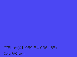 CIELab 41.959,54.036,-85 Color is a light indigo color and the nearest color is Majorelle Blue #6050dc. Hex code #4b47f3 and RGB value is rgb(75,71,243). In RGB color space, this color is composed of 29% red, 28% green, 95% blue, In CMYK color space, this color is composed of 69% cyan, 71% magenta, 0% yellow , 5% black , In HSL color space, this color has a hue angle of 241° , 88% saturation and 62% lightness.