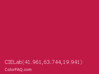 CIELab 41.961,63.744,19.941 Color is a normal rose color and the nearest color is Maroon Flush #c32148. Hex code #c11946 and RGB value is rgb(193,25,70). In RGB color space, this color is composed of 76% red, 10% green, 27% blue, In CMYK color space, this color is composed of 0% cyan, 87% magenta, 64% yellow , 24% black , In HSL color space, this color has a hue angle of 344° , 77% saturation and 43% lightness.