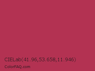 CIELab 41.96,53.658,11.946 Color is a normal red color and the nearest color is Night Shadz #aa375a. Hex code #b33252 and RGB value is rgb(179,50,82). In RGB color space, this color is composed of 70% red, 20% green, 32% blue, In CMYK color space, this color is composed of 0% cyan, 72% magenta, 54% yellow , 30% black , In HSL color space, this color has a hue angle of 345° , 56% saturation and 45% lightness.