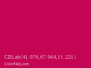 CIELab 41.976,67.964,11.221 Color is a normal rose color and the nearest color is Pictorial Carmine #c30b4e. Hex code #c40554 and RGB value is rgb(196,5,84). In RGB color space, this color is composed of 77% red, 2% green, 33% blue, In CMYK color space, this color is composed of 0% cyan, 97% magenta, 57% yellow , 23% black , In HSL color space, this color has a hue angle of 335° , 95% saturation and 39% lightness.