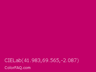 CIELab 41.983,69.565,-2.087 Color is a normal rose color and the nearest color is Rubine Red #d10056. Hex code #c20069 and RGB value is rgb(194,0,105). In RGB color space, this color is composed of 76% red, 0% green, 41% blue, In CMYK color space, this color is composed of 0% cyan, 100% magenta, 46% yellow , 24% black , In HSL color space, this color has a hue angle of 328° , 100% saturation and 38% lightness.