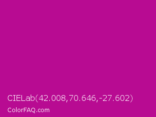 CIELab 42.008,70.646,-27.602 Color is a normal magenta color and the nearest color is Red Violet #c71585. Hex code #b80b92 and RGB value is rgb(184,11,146). In RGB color space, this color is composed of 72% red, 4% green, 57% blue, In CMYK color space, this color is composed of 0% cyan, 94% magenta, 21% yellow , 28% black , In HSL color space, this color has a hue angle of 313° , 89% saturation and 38% lightness.