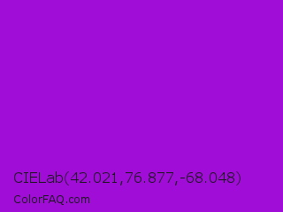 CIELab 42.021,76.877,-68.048 Color is a normal purple color and the nearest color is Dark Violet #9400d3. Hex code #9f0dd6 and RGB value is rgb(159,13,214). In RGB color space, this color is composed of 62% red, 5% green, 84% blue, In CMYK color space, this color is composed of 26% cyan, 94% magenta, 0% yellow , 16% black , In HSL color space, this color has a hue angle of 284° , 89% saturation and 45% lightness.