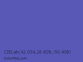 CIELab 42.034,26.828,-50.408 Color is a normal indigo color and the nearest color is Blue Violet #6456b7. Hex code #5958b7 and RGB value is rgb(89,88,183). In RGB color space, this color is composed of 35% red, 35% green, 72% blue, In CMYK color space, this color is composed of 51% cyan, 52% magenta, 0% yellow , 28% black , In HSL color space, this color has a hue angle of 241° , 40% saturation and 53% lightness.