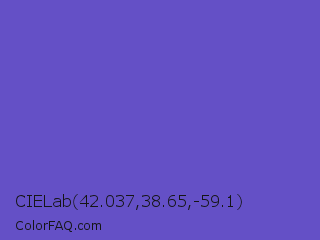 CIELab 42.037,38.65,-59.1 Color is a normal indigo color and the nearest color is Iris #5a4fcf. Hex code #6450c6 and RGB value is rgb(100,80,198). In RGB color space, this color is composed of 39% red, 31% green, 78% blue, In CMYK color space, this color is composed of 49% cyan, 60% magenta, 0% yellow , 22% black , In HSL color space, this color has a hue angle of 250° , 51% saturation and 55% lightness.