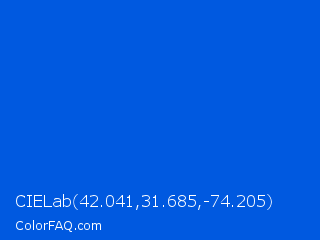 CIELab 42.041,31.685,-74.205 Color is a normal blue color and the nearest color is Science Blue #0066cc. Hex code #0059e0 and RGB value is rgb(0,89,224). In RGB color space, this color is composed of 0% red, 35% green, 88% blue, In CMYK color space, this color is composed of 100% cyan, 60% magenta, 0% yellow , 12% black , In HSL color space, this color has a hue angle of 216° , 100% saturation and 44% lightness.