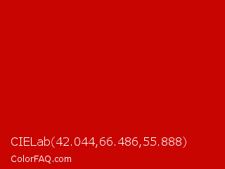 CIELab 42.044,66.486,55.888 Color is a normal red color and the nearest color is Boston University Red #cc0000. Hex code #c90501 and RGB value is rgb(201,5,1). In RGB color space, this color is composed of 79% red, 2% green, 0% blue, In CMYK color space, this color is composed of 0% cyan, 98% magenta, 100% yellow , 21% black , In HSL color space, this color has a hue angle of 1° , 99% saturation and 40% lightness.