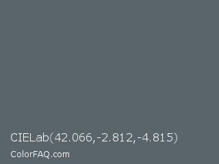 CIELab 42.066,-2.812,-4.815 Color is a normal blue color and the nearest color is Black Coral #54626f. Hex code #5a656b and RGB value is rgb(90,101,107). In RGB color space, this color is composed of 35% red, 40% green, 42% blue, In CMYK color space, this color is composed of 16% cyan, 6% magenta, 0% yellow , 58% black , In HSL color space, this color has a hue angle of 201° , 9% saturation and 39% lightness.
