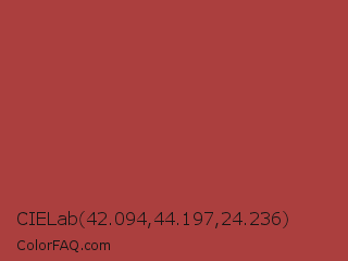 CIELab 42.094,44.197,24.236 Color is a normal red color and the nearest color is Medium Carmine #af4035. Hex code #ab3f3e and RGB value is rgb(171,63,62). In RGB color space, this color is composed of 67% red, 25% green, 24% blue, In CMYK color space, this color is composed of 0% cyan, 63% magenta, 64% yellow , 33% black , In HSL color space, this color has a hue angle of 1° , 47% saturation and 46% lightness.