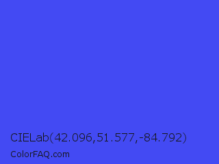 CIELab 42.096,51.577,-84.792 Color is a light blue color and the nearest color is Ultramarine Blue #4166f5. Hex code #434af3 and RGB value is rgb(67,74,243). In RGB color space, this color is composed of 26% red, 29% green, 95% blue, In CMYK color space, this color is composed of 72% cyan, 70% magenta, 0% yellow , 5% black , In HSL color space, this color has a hue angle of 238° , 88% saturation and 61% lightness.