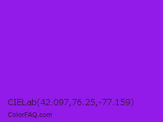 CIELab 42.097,76.25,-77.159 Color is a normal purple color and the nearest color is Veronica #a020f0. Hex code #921ae6 and RGB value is rgb(146,26,230). In RGB color space, this color is composed of 57% red, 10% green, 90% blue, In CMYK color space, this color is composed of 37% cyan, 89% magenta, 0% yellow , 10% black , In HSL color space, this color has a hue angle of 275° , 80% saturation and 50% lightness.