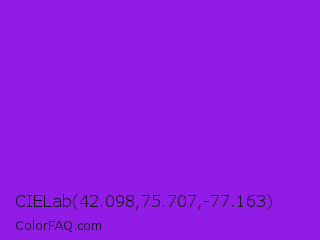CIELab 42.098,75.707,-77.163 Color is a normal purple color and the nearest color is Blue Violet #8a2be2. Hex code #911ce6 and RGB value is rgb(145,28,230). In RGB color space, this color is composed of 57% red, 11% green, 90% blue, In CMYK color space, this color is composed of 37% cyan, 88% magenta, 0% yellow , 10% black , In HSL color space, this color has a hue angle of 275° , 80% saturation and 51% lightness.