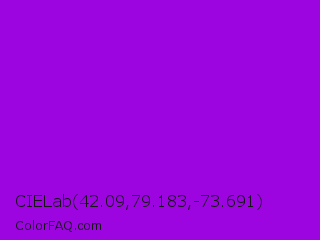 CIELab 42.09,79.183,-73.691 Color is a normal purple color and the nearest color is Dark Violet #9400d3. Hex code #9c05e0 and RGB value is rgb(156,5,224). In RGB color space, this color is composed of 61% red, 2% green, 88% blue, In CMYK color space, this color is composed of 30% cyan, 98% magenta, 0% yellow , 12% black , In HSL color space, this color has a hue angle of 281° , 96% saturation and 45% lightness.