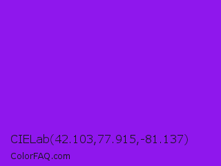 CIELab 42.103,77.915,-81.137 Color is a normal purple color and the nearest color is Veronica #a020f0. Hex code #8f17ed and RGB value is rgb(143,23,237). In RGB color space, this color is composed of 56% red, 9% green, 93% blue, In CMYK color space, this color is composed of 40% cyan, 90% magenta, 0% yellow , 7% black , In HSL color space, this color has a hue angle of 274° , 86% saturation and 51% lightness.
