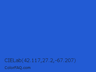 CIELab 42.117,27.2,-67.207 Color is a normal blue color and the nearest color is Mariner #286acd. Hex code #225bd4 and RGB value is rgb(34,91,212). In RGB color space, this color is composed of 13% red, 36% green, 83% blue, In CMYK color space, this color is composed of 84% cyan, 57% magenta, 0% yellow , 17% black , In HSL color space, this color has a hue angle of 221° , 72% saturation and 48% lightness.