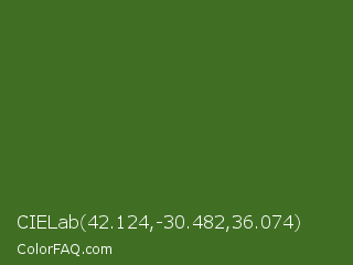 CIELab 42.124,-30.482,36.074 Color is a dark green color and the nearest color is Dark Moss Green #4a5d23. Hex code #406f23 and RGB value is rgb(64,111,35). In RGB color space, this color is composed of 25% red, 44% green, 14% blue, In CMYK color space, this color is composed of 42% cyan, 0% magenta, 68% yellow , 56% black , In HSL color space, this color has a hue angle of 97° , 52% saturation and 29% lightness.