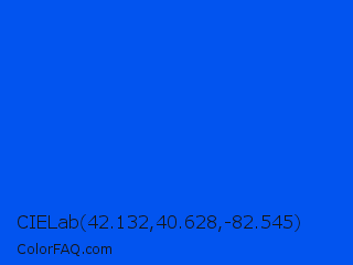 CIELab 42.132,40.628,-82.545 Color is a normal blue color and the nearest color is Blue RYB #0247fe. Hex code #0254ef and RGB value is rgb(2,84,239). In RGB color space, this color is composed of 1% red, 33% green, 94% blue, In CMYK color space, this color is composed of 99% cyan, 65% magenta, 0% yellow , 6% black , In HSL color space, this color has a hue angle of 219° , 98% saturation and 47% lightness.