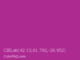 CIELab 42.13,61.792,-26.952 Color is a normal magenta color and the nearest color is Fandango #b53389. Hex code #ad2a91 and RGB value is rgb(173,42,145). In RGB color space, this color is composed of 68% red, 16% green, 57% blue, In CMYK color space, this color is composed of 0% cyan, 76% magenta, 16% yellow , 32% black , In HSL color space, this color has a hue angle of 313° , 61% saturation and 42% lightness.