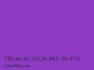 CIELab 42.152,56.883,-56.374 Color is a normal purple color and the nearest color is Dark Orchid #9932cc. Hex code #8c3bc2 and RGB value is rgb(140,59,194). In RGB color space, this color is composed of 55% red, 23% green, 76% blue, In CMYK color space, this color is composed of 28% cyan, 70% magenta, 0% yellow , 24% black , In HSL color space, this color has a hue angle of 276° , 53% saturation and 50% lightness.