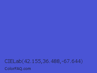 CIELab 42.155,36.488,-67.644 Color is a normal blue color and the nearest color is Iris #5a4fcf. Hex code #4a54d5 and RGB value is rgb(74,84,213). In RGB color space, this color is composed of 29% red, 33% green, 84% blue, In CMYK color space, this color is composed of 65% cyan, 61% magenta, 0% yellow , 16% black , In HSL color space, this color has a hue angle of 236° , 62% saturation and 56% lightness.