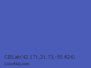 CIELab 42.171,21.73,-50.824 Color is a normal blue color and the nearest color is Liberty #545aa7. Hex code #4b5cb8 and RGB value is rgb(75,92,184). In RGB color space, this color is composed of 29% red, 36% green, 72% blue, In CMYK color space, this color is composed of 59% cyan, 50% magenta, 0% yellow , 28% black , In HSL color space, this color has a hue angle of 231° , 43% saturation and 51% lightness.