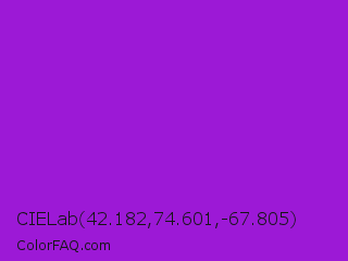 CIELab 42.182,74.601,-67.805 Color is a normal purple color and the nearest color is Dark Violet #9400d3. Hex code #9c19d6 and RGB value is rgb(156,25,214). In RGB color space, this color is composed of 61% red, 10% green, 84% blue, In CMYK color space, this color is composed of 27% cyan, 88% magenta, 0% yellow , 16% black , In HSL color space, this color has a hue angle of 282° , 79% saturation and 47% lightness.
