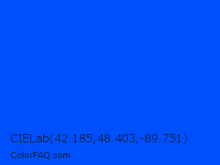CIELab 42.185,48.403,-89.751 Color is a normal blue color and the nearest color is Blue RYB #0247fe. Hex code #004ffc and RGB value is rgb(0,79,252). In RGB color space, this color is composed of 0% red, 31% green, 99% blue, In CMYK color space, this color is composed of 100% cyan, 69% magenta, 0% yellow , 1% black , In HSL color space, this color has a hue angle of 221° , 100% saturation and 49% lightness.
