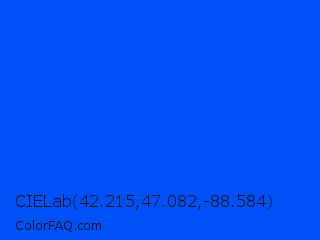 CIELab 42.215,47.082,-88.584 Color is a normal blue color and the nearest color is Blue RYB #0247fe. Hex code #0050fa and RGB value is rgb(0,80,250). In RGB color space, this color is composed of 0% red, 31% green, 98% blue, In CMYK color space, this color is composed of 100% cyan, 68% magenta, 0% yellow , 2% black , In HSL color space, this color has a hue angle of 221° , 100% saturation and 49% lightness.